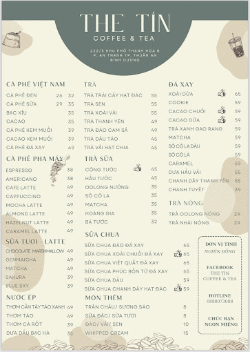 The Tín Coffee & Tea chuyên phục vụ các món cà phê được pha chế bởi tay nghề nhiều năm kinh nghiệm. Bên cạnh những món cà phê phin quen thuộc như cà phê đen, cà phê sữa, bạc xỉu, cacao, nơi đây còn có đa dạng loại cà phê pha máy bao gồm espresso, americano, cafe latte, cappuccino, caramel và cafe mocha rất hấp dẫn. Giá cho một ly cà phê The Tín chỉ dao động vào khoảng từ 30.000 VNĐ đến 50.000 VNĐ.