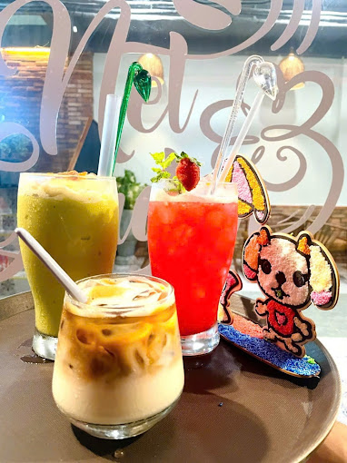 Menu quán cũng rất đa dạng bao gồm cả ăn và uống với giá cả vô cùng hợp lý. Món uống có các món thuộc các danh mục như cà phê, sinh tố, yaourt, nước ép, nước ngọt, trà sữa, trà trái cây, soda, ... Món ăn thì phần lớn là các món ăn vặt quen thuộc như xúc xích, bò viên, gà rán, khoai tây chiên, tokbokki, ...