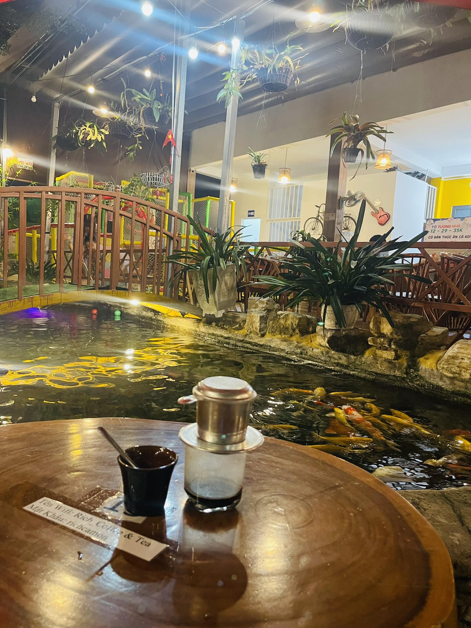 Hồ cá koi: Quán có một hồ cá koi lớn với nhiều chú cá đầy màu sắc, mang lại không gian thư giãn và yên bình. Đây là nơi nhiều khách hàng, đặc biệt là các bạn nhỏ, thích thú ngắm nhìn và chụp ảnh.